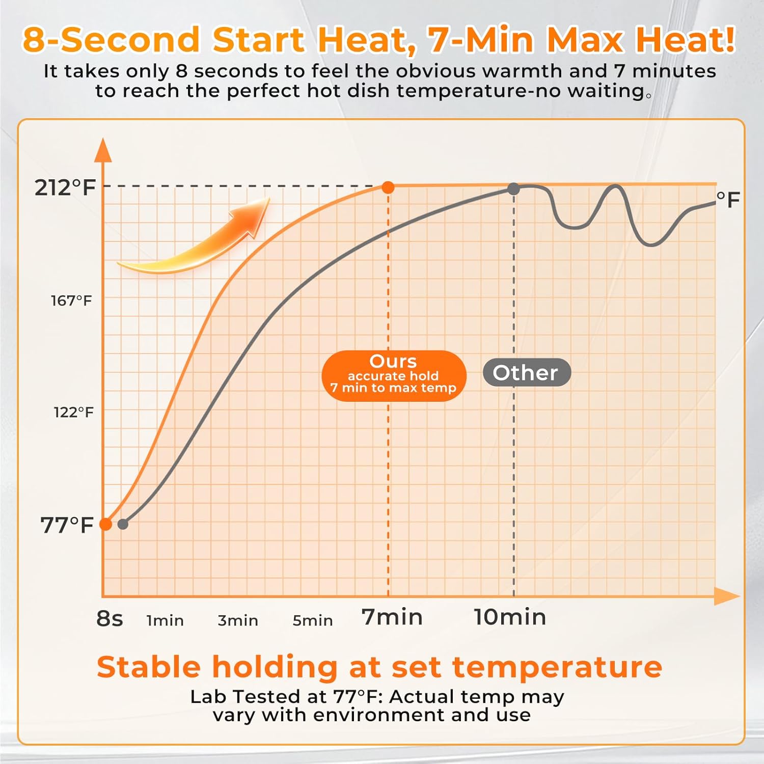 Answer 2: The warming mat quickly reaches its maximum heating temperature in just 7 minutes, providing efficient and convenient warming with a simple one-touch activation.